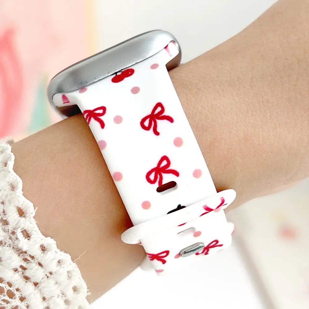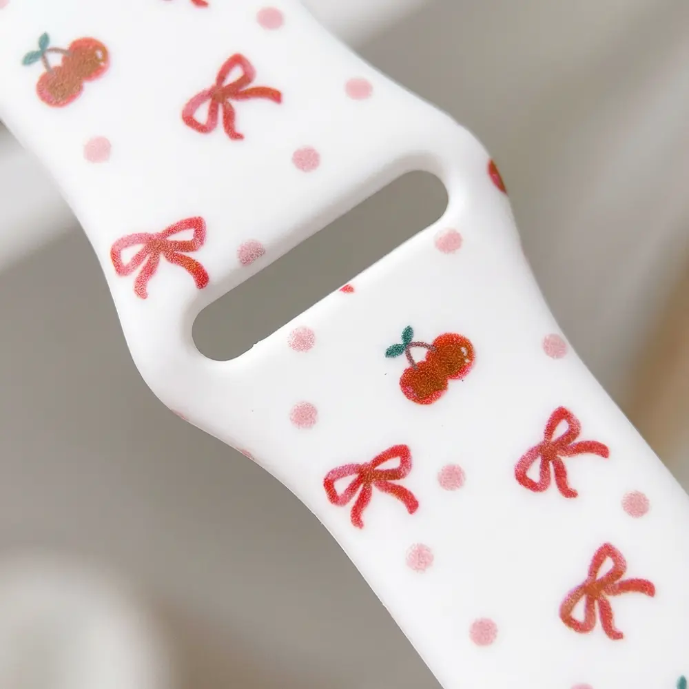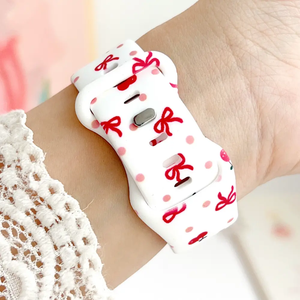 Refresh your wristwear with the Cherry & Bow Silicone Apple Watch Strap, featuring a dreamy combination of retro cherries and delicate bows. It brings a fresh, summery charm to your modern tech while keeping your wrist comfortable all day long.